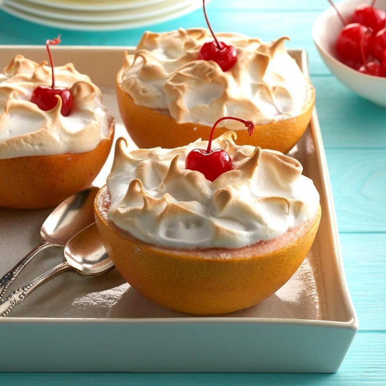 Klop in een grote kom op matige snelheid de eiwitten, maizena en room van wijnsteen tot zich zachte pieken vormen. Klop de suiker in suiker, 1 eetlepel per keer, op hoog tot er stijve, glanzende pieken ontstaan en suiker wordt opgelost. Een kop met een inhoud van 130 ml met op elke grapefruithelft; verdeel meringue naar randen om te verzegelen.Bak bij 350 ° gedurende 15 minuten of tot meringue bruin is.Top elk met een kers. Onmiddellijk bewaren.