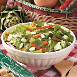 Gegarneerd met verkruimelde feta-kaas, bevat de snelle salade komkommer, rode peper en een citroenachtige zelfgemaakte dressing. Deze salade wordt snel samengegooid. -Taste of Home Test Kitchen, Greendale, Wisconsin