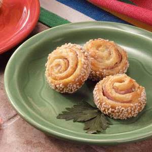 Rol het deeg uit in twee rechthoeken; zeehond perforaties. Plaats ham op rechthoeken. Verspreid mosterd over ham; bestrooi met kaas.Rol op van een korte kant; centimeter naden om te verzegelen. Rol in sesamzaad. Snijd elke rol in 5 plakken. Plaats de plakjes op de bovenkant op een niet-ingevette bakplaat.