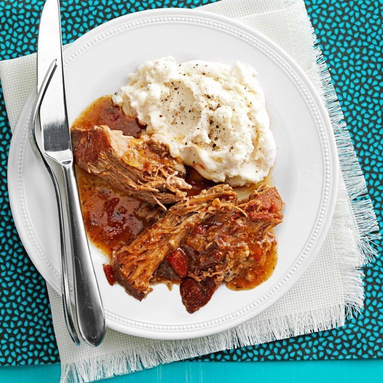 Strooi gebraden met zout en peper. Selecteer bak en regel voor hoge hitte in een 6 liter.electric snelkookpan; verwarm olie. Gebroeid aan alle kanten. Voeg tomaten en ui toe; giet bouillon en wijn rond het vlees. Combineer de mosterd, knoflook, honing, melasse en tijm; giet over varkensvlees