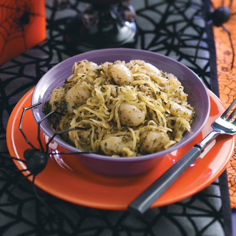 We gebruiken een "web" van spaghettipompoen om op slimme wijze gnocchi "beestjes" te vangen in dit bijgerecht op basis van pesto. -Taste of Home Test Kitchen