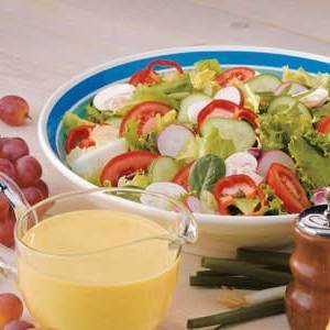 Terri Webber uit Miami, Florida combineert zoete honing met pittige Dijon-mosterd in dit snel te maken recept. De romig-gele mix bedekt gemengde saladegroen met een milde, pittige smaak. "Niemand zou ooit kunnen raden dat dit weinig vet bevat," Terri vertrouwt.