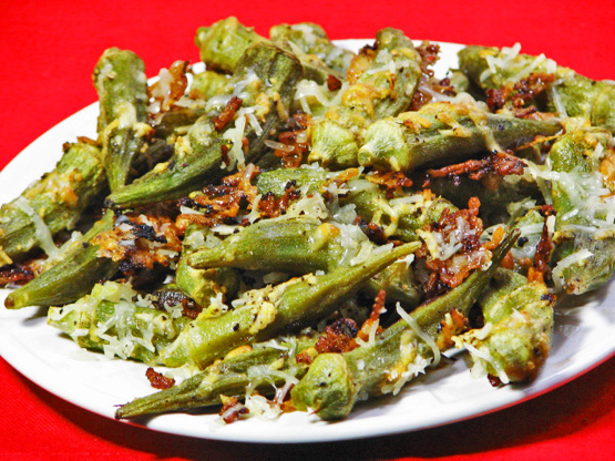 Haal de okra uit de oven en leg hem meteen bovenop met geraspte kaas.