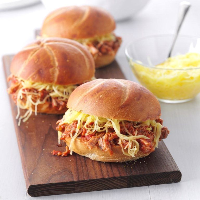 Braadstuk verwijderen; gooi het vruchtensap weg.Wanneer het voldoende koel is om te verwerken, versnippert u het vlees met twee vorken. Voer het vlees terug in het langzame fornuis. Doe de saus erin; warmte door.