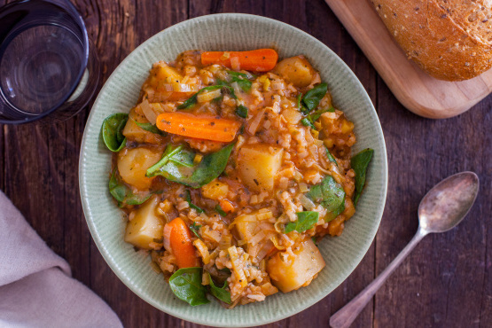 Italiaanse aardappel, rijst en spinazie soep in snelkookpan