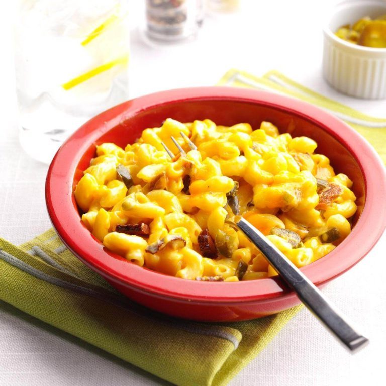 Giet macaroni leeg en keer terug naar pot; Roer de kaassaus erdoorheen. Overdracht naar een ingevette 13x9-inch bakplaat; bestrooi met de overgebleven kaas en het gereserveerde spek. Bak, onbedekt, 8-10 minuten of tot de kaas is gesmolten.
