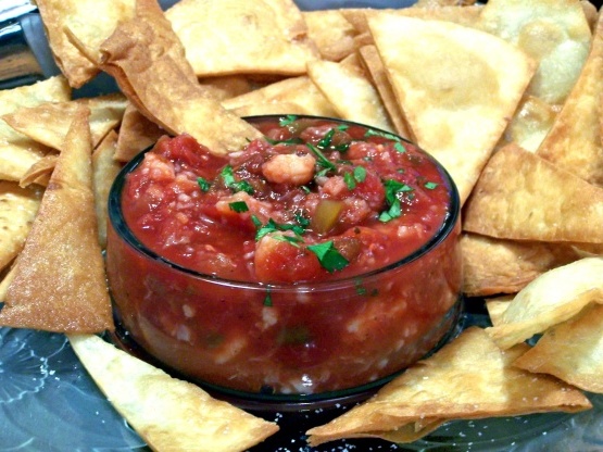 10 minSalsasui, tomaten, wijnazijn, teentjes knoflook, olie-, peterselie, chili saus, afhankelijk van wat je wilt, zout, peper,chili salsa -