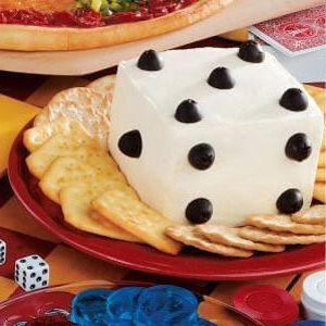 Verwijder het roomkaasmengsel uit de pan; snij in de helft in de breedte. Zet de een op de andere op een serveerschaal. Klop in een kleine kom de melk en de resterende roomkaas tot een glad mengsel. Spreid over de kubus. Snijd de olijven doormidden; schikken op de bovenkant en zijkanten van dobbelstenen. Bewaar met crackers