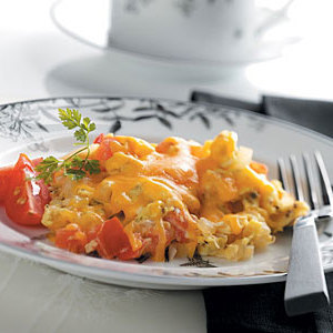 Verwen jezelf een zonnige ochtend met dit heerlijke eiergerecht dat één portie serveert ... je bent het zeker waard! "Ik heb veel complimenten gekregen over dit recept; basilicum geeft het een frisse smaak. "Vickey Abate - Green Island, NY
