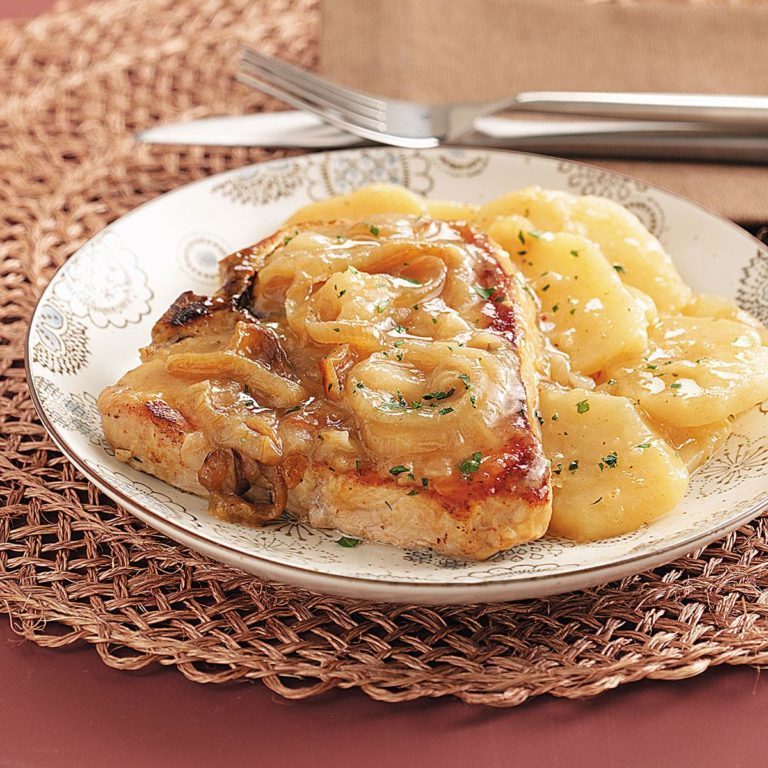 Plaats koteletten over aardappelen. Zure uien in drippings tot zacht; Plaats over de karbonades. Smelt de boter in de koekenpan. Meng de bloem, zout, peper en bouillon tot een gladde massa. Roer in de pan. Voeg melk toe. Aan de kook brengen; kook en roer 2 minuten of tot ingedikt