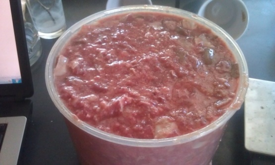De supplementen worden toegevoegd aan het water en, zodra ze allemaal zijn opgelost, wordt deze voedingssupplement toegevoegd aan de vlees/botten / huid / lever / eieren. Gebruik de handen om het voedsel grondig te mengen. Nadat het voedsel goed is gemengd, wordt het in porties verdeeld in containers en in de vriezer gelegd.