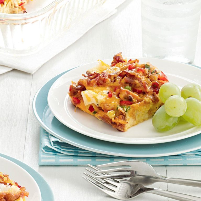 Ik bereid deze zonsopgangspecialiteit voor op de dag vóór Kerstmis, zodat we iets cheesy en hartelijks hebben om onze buik te verwarmen terwijl we de volgende ochtend geschenken openen. De sleutel tot zijn perfectie is om hem 's nachts te laten rusten. - Deb Healey, Cold Lake, Alberta