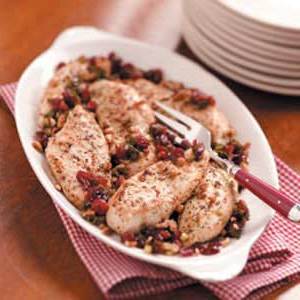 Deze sappige kippenborsten hebben heel weinig zout, maar ze zijn goed gekruid en vol van smaak. De dikke cranberrysaus en geroosterde pecannoten maken de snelle doordeweekse avond speciaal. -Margee Berry van White Salmon, Washington