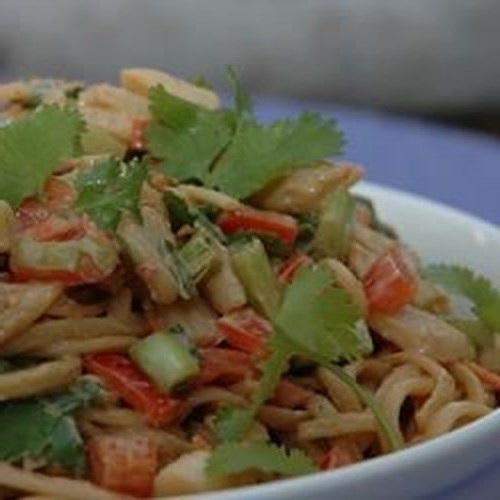 Kippennoedelsalade met dressing van pinda-gember