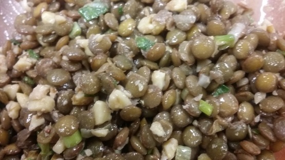 Giet de linzen goed af en meng ze in het verband terwijl ze nog warm zijn, roer om de linzen te koken. Verwijder het laurierblad en laat afkoelen tot kamertemperatuur, af en toe roeren.