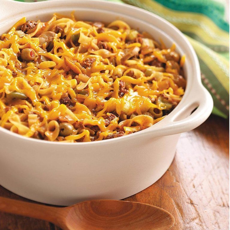In een Nederlandse oven, kook rundvlees en uien op middelhoog vuur tot het vlees niet meer roze is. Voeg knoflook toe; kook 1 minuut langer.Drain.Laat in de overige ingrediënten behalve kaas.