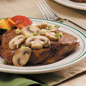 Lissa Hutson uit Phelan, Californië deelde dit eenvoudige voorgerecht. De stevige biefstuk is goed gekruid met een robuuste marinade en wordt geserveerd met een verse champignonsaus.