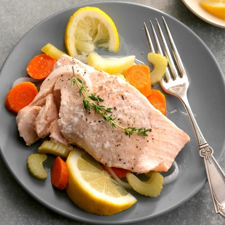 100 minTaste of Home Magazine Dinner Receptenwater, wijn, ui, selderij rib, wortel, Citroen, tijm, rosmarijn, baai, zout, peper, zalmfilet, Citroen,kruid en groente gepocheerde zalm -