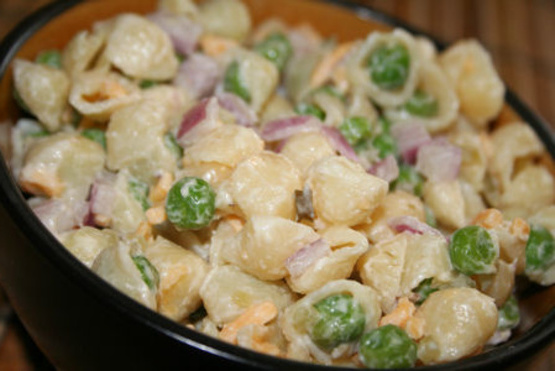 Meng afgekoelde macaroni, erwten, sheese, augurken, mirakelzweep en ui.