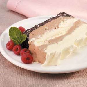 Schep de helft van het chocolademengsel over de korst. Bedek met de helft van het gereserveerde roomkaasmengsel. Herhaal de lagen (de pan is vol). Vries, onafgedekt, gedurende 6 uur of tot de set. Bedek en vries tot het serveren. Gebruik folie om op te heffen van de pan; in plakjes snijden.