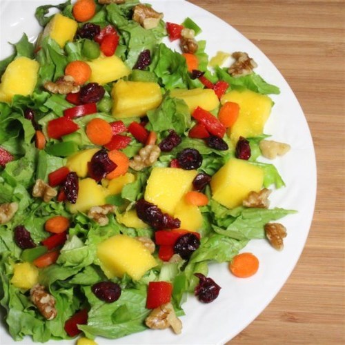 Leg in een grote kom de mango's, sla, walnoten, veenbessen, rode en groene paprika's en wortel voorzichtig op elkaar.