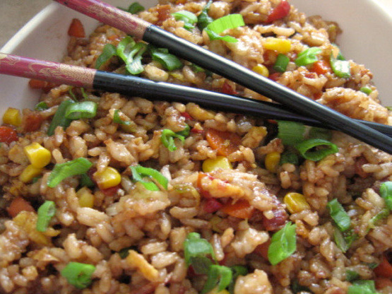 Voeg alle groenten toe aan de pan en roerbak met spek en eieren tot ze knapperig zijn.