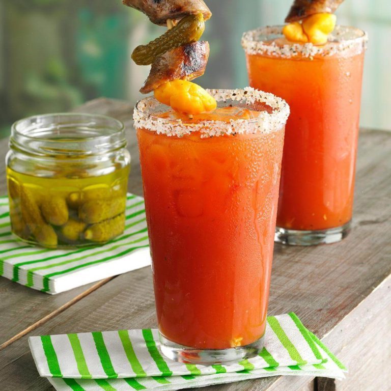 Meng in een grote kruik tomatensap, bier, wodka, citroensap, hete pepersaus en Worcestershire-saus; Giet in voorbereide glazen. Garneer met spiesen van braadworst, kaas en augurken.