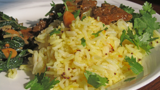 Aangepast van Time-Life Foods of the World. Zwarte mosterdzaadjes zijn hetzelfde als bruine mosterdzaadjes. Als je ze niet kunt vinden, kun je gele mosterdzaadjes gebruiken, maar de smaak zal niet zo sterk zijn. Ik vermeld het kokende water en het water dat wordt gebruikt om de rijst afzonderlijk te koken, voor de duidelijkheid. Let op: je hebt een braadpanschotel nodig die zowel in de oven als op de kookplaat veilig kan worden gebruikt.