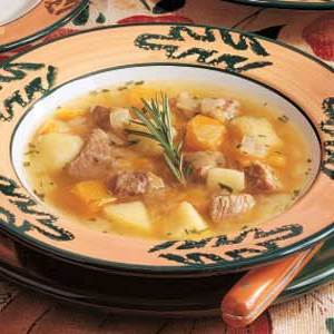 Bak in een grote pan varkensvlees en ui in boter tot het vlees zacht is. Voeg knoflook toe; kook 1 minuut langer.Drain.Voeg de bouillon, zout, rozemarijn, salie en laurier toe. Bedek en laat gedurende 20 minuten sudderen.