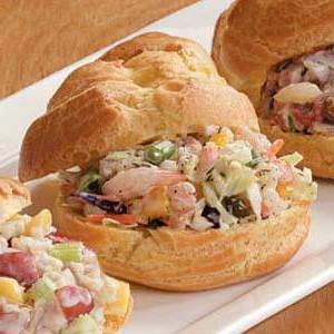 Koelen tot serveren. Net voor het opdienen een 130 liter garnalensalade in elke slagroomgarnaal scheppen; vervang tops.