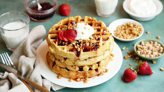 Deze pindakaaswafels worden bedekt met verwarmde aardbeiengelei om ze een PBandJ sandwich-smaak te geven die niet te kloppen is.