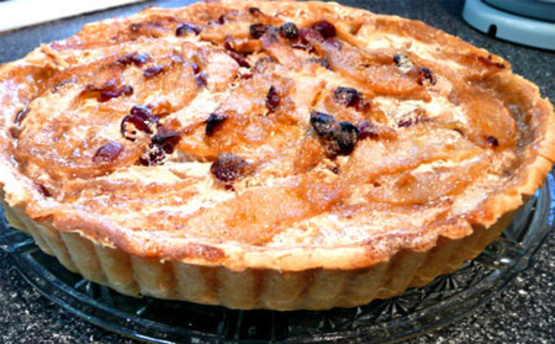 Meng de schijfjes peer, citroen en sinaasappelschil, rozijnen en olie en spreid dit dan uit op de taartvorm. Bevochtig het mengsel met de witte wijn (alles of een deel van de wijn, afhankelijk van de hoeveelheid perensap in de vlaai) .