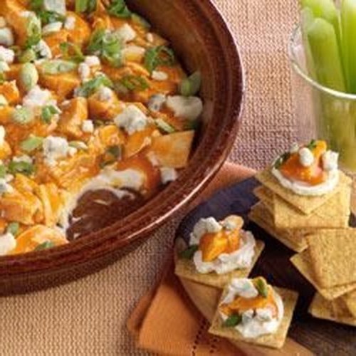 Smeer roomkaas op de onderkant van de magnetron centimeter taartplaat. Mix kip en saus; lepel over roomkaas.Top met blauwe kaas en uien.