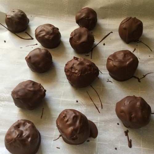 Om ballen in chocolade te dopen: in de bovenste helft van een dubbele ketel; Smelt de chocoladestukjes en bak ze in tot de chips zijn gesmolten.Verwijder van het vuur maar laat het warme water achter.Verplaats een tandenstoker in de gekoelde ballen en dompel deze in de gesmolten chocolade tot ze zijn gecoat. Zet op vetvrij papier tot ze gehard zijn.