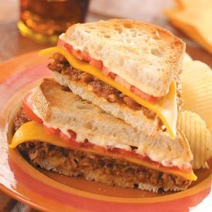 Combineer chipotle peper en mayonaise; Verspreid over toast. Lepel Een kop met een inhoud van 130 ml met vleesmengsel op elk van de acht sneetjes toast. Bedek met kaas, tomaten en resterende toast.
