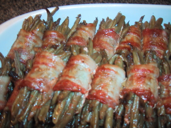 Wikkel een goede hand vol (12-15) bonen met het spek en leg de naad naar beneden op een gevoerde lakenpan besproeid met pam.