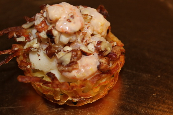 When nests are done, lift them out of tin and place on platter.Put mashed potatoes in a pastry bag or plastic storage bag and cut off tip of it.I then place a small swirl of mashed potatoes in nests and then place a helping of the shrimp on top.These really are best served while the potatoes are warm but they are pretty good cold too!
