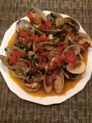 40 minClamsolie-, ui, paprika, paprika, teentjes knoflook, baai, tomaten, wijn, littleneck clams scminced, peper,spaanse clams