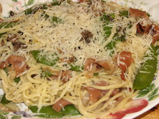 Dit is een eenvoudig recept vol smaak van de rokerige zoutigheid van de prosciutto, tot zoete gestoomde erwten, tot zachte champignons, tot een ondertoon van knoflook en uien en tenslotte overgoten met vers geraspte Parmezaanse kaas.