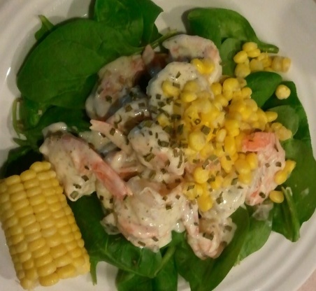 45 minWeeknightboter, cajunkruiden, Boerderij kruiden, zure room, brood, kaas, bieslook, spinazie eet, garnalen deviled staarten inact, maïs,ra'cajun romige spinazie salade rsc -