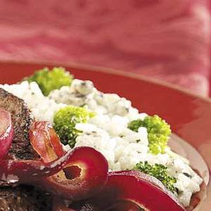 Doe de broccoli en het resterende water in een kleine magnetronbestendige schaal. Bedek de magnetron en zet hem 2-3 minuten op de magnetron of tot hij knapperig is; drain. Verdun met rijst. Spring met blauwe kaas.