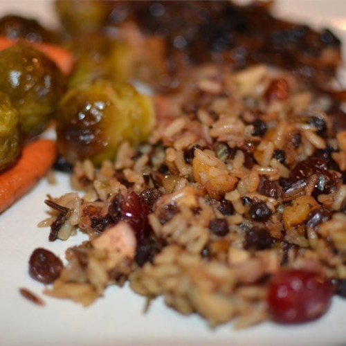 Roer het resterende water, witte rijst, krenten, kersen, veenbessen, abrikozen en appels door de wilde rijst. Blijven koken 20 minuten, of totdat wilde rijst en witte rijst zacht zijn.