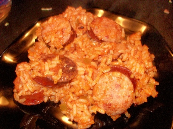 Verhit de olie in een zware pan op middelhoog vuur. Voeg de worststukjes toe en kook tot bruin, ongeveer 5 minuten. Voeg de uien, groene paprika's en selderij toe.Kook gedurende 3 minuten. Voeg het water, tomatensaus, zout en peper toe. Verhit aan de kook. Roer in de rijst. Laat de hitte stoven. Laat afgedekt koken tot de rijst gaar is, ongeveer 30 minuten.Verwijder van het vuur en houd afgedekt tot het moment om te serveren.