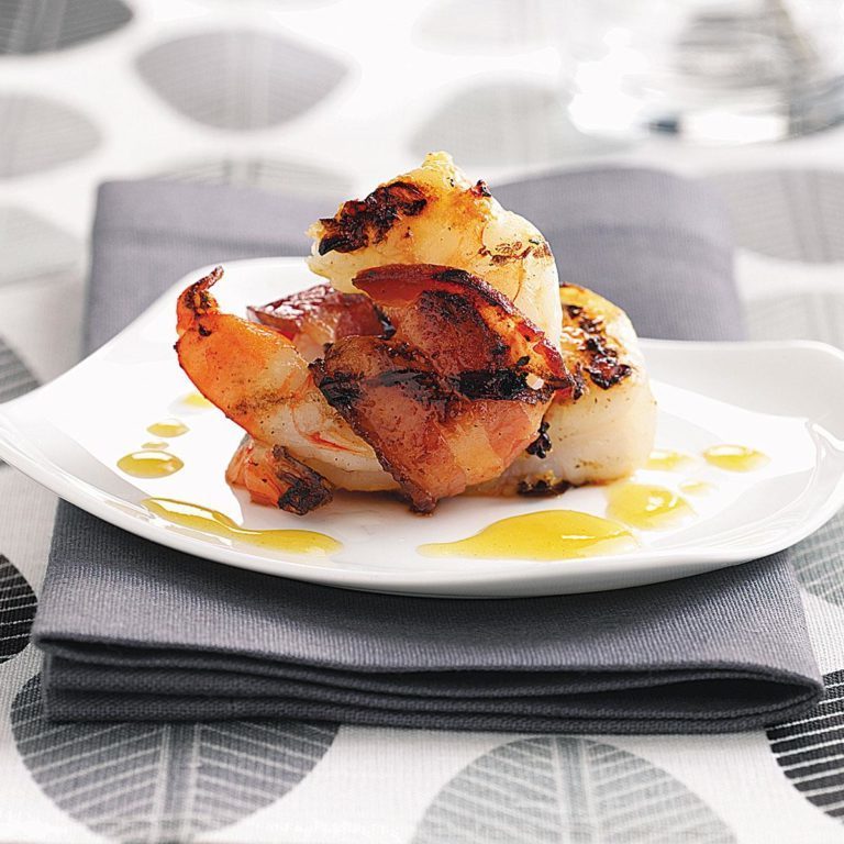Grill deze bacon-ingepakte hors d'oeuvres op en zie ze verdwijnen! Ze smaken net zo heerlijk als ze eruit zien, en de gereserveerde saus is geweldig om te dippen. - Debbie Taylor, White Bluff, Tennessee