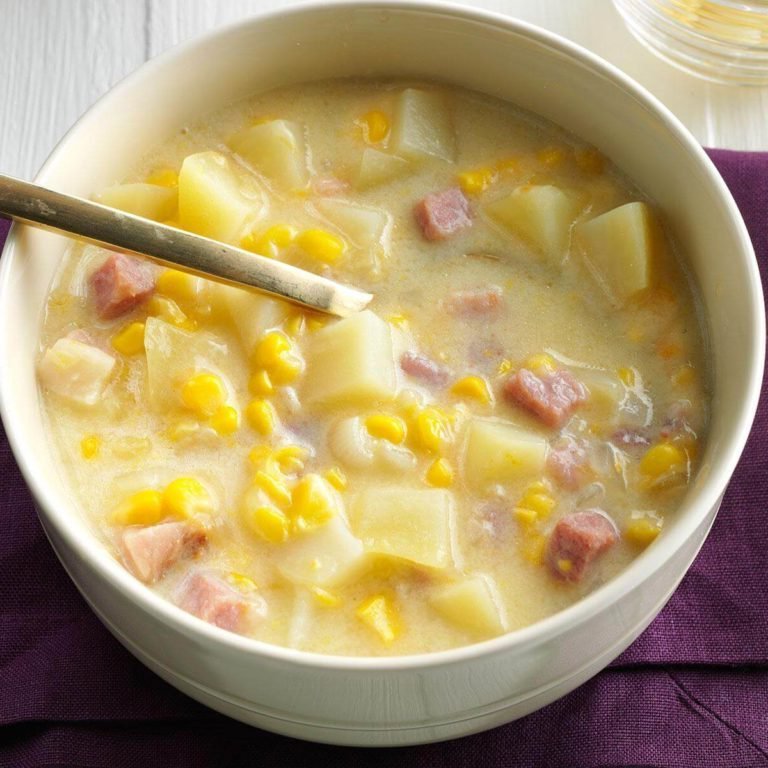 In een Nederlandse oven, kook en roerham op middelhoog vuur tot ze bruin is. Voeg aardappelen, melk, maïs en ui toe. Aan de kook brengen. Verminder hitte; laat sudderen, onbedekt, 20-25 minuten of tot aardappelen zacht zijn.