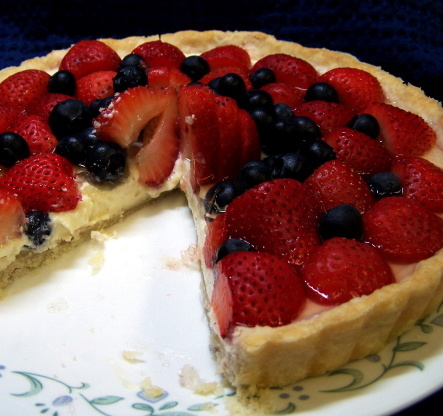 Dit recept is van. Het is heel gemakkelijk te maken en heerlijk. Een geweldige zomerse traktatie voor verse bessen en de presentatie is zo elegant. Dit zou een grote taart zijn voor 4 juli. Het recept vraagt om een voorafkerende korst. Ik gebruikte Flaky Pie Crust Recipe 20984 door Teresa M.