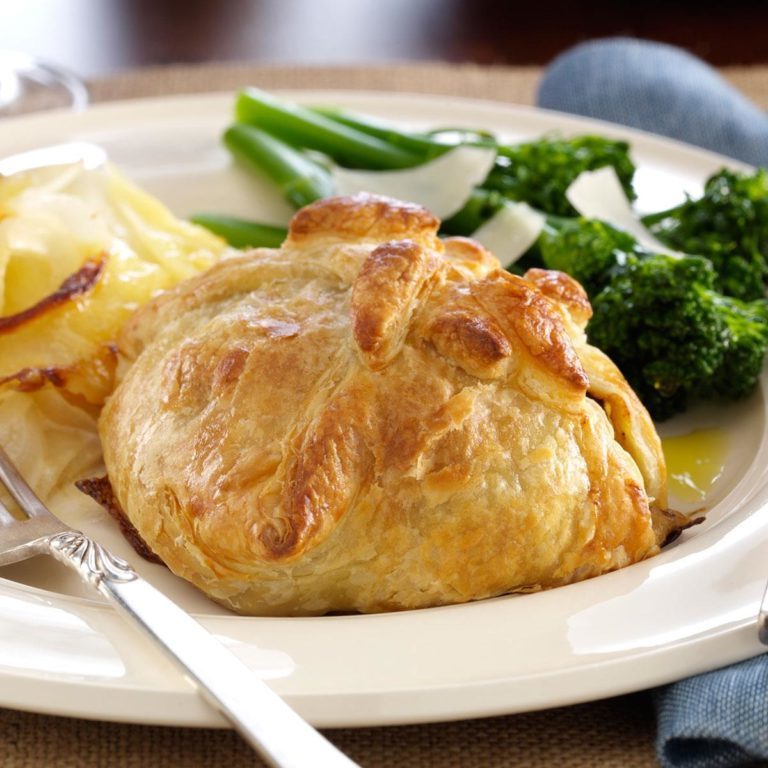 45 minTaste of Home Magazine Dinner Receptenbiefstuk, zout verdeeld, peper verdeeld, olie-, paddestoel, ui, bladerdeeg, ei,runderwellington met wijnsaus -
