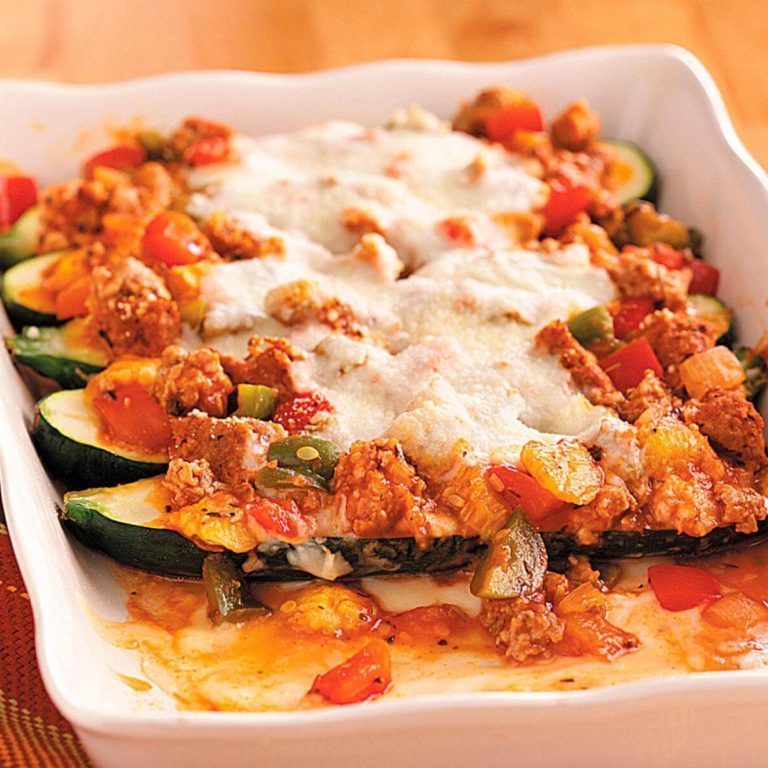 Hak courgetoppulp. Plaats pulp in een pan; voeg de worst, paprika, ui, Italiaanse kruiden en tomatensaus toe. Breng aan de kook. Verminder hitte; dek af en laat 5 minuten sudderen. Plaats courgette schelpen in een ingevette 13-in.x 9-inch.schotel. Lepelvulling in schaaltjes
