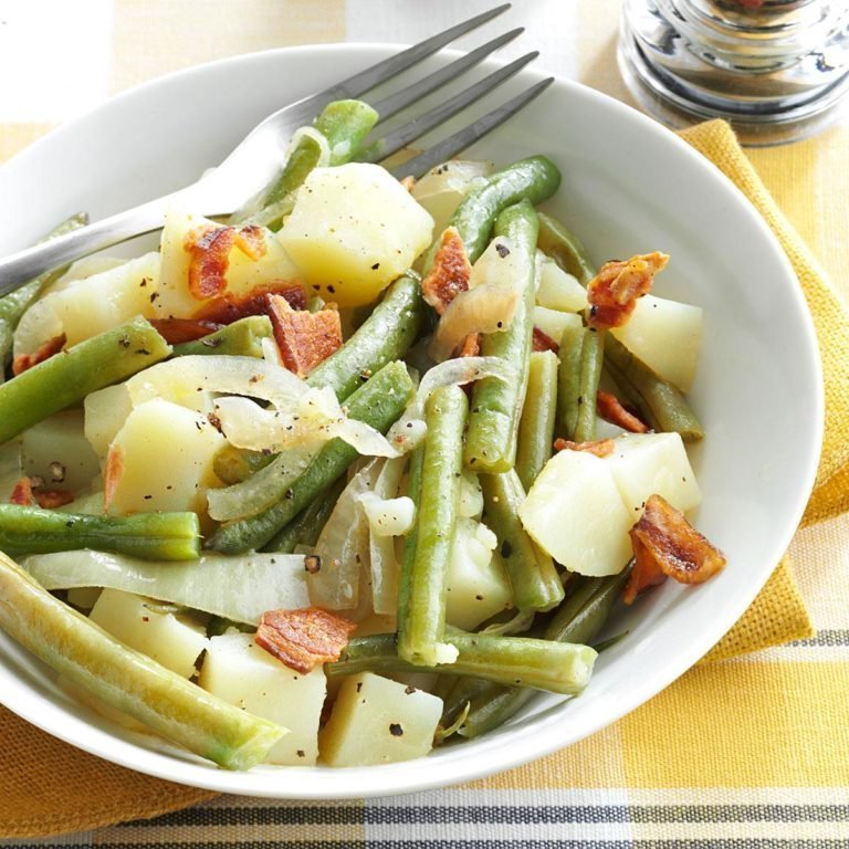 Ik ben dol op de combinatie van sperziebonen met spek, dus ik heb dit recept gemaakt. Als je gezelschap hebt, kun je het bijgerecht starten in het slowcooker en doorgaan met het voorbereiden van het diner ... of een bezoek brengen aan je gasten! -Barbara Brittain, Santee, Californië