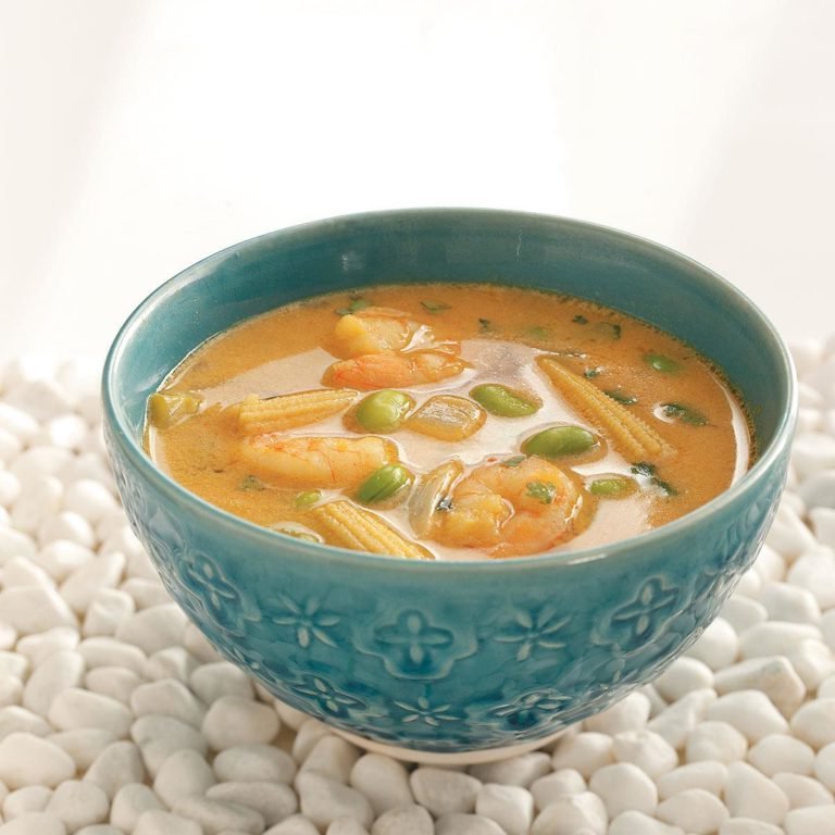 In een Nederlandse oven bak je de ui in olie tot ze zacht is. Voeg de bouillon, water, bruine suiker, gember, vissaus, currypasta en citroengras toe. Breng aan de kook. Laat de hitte af; roer voorzichtig garnalen en edamame door elkaar. Bak 5-7 minuten onafgedekt, of tot de garnalen roze kleuren.